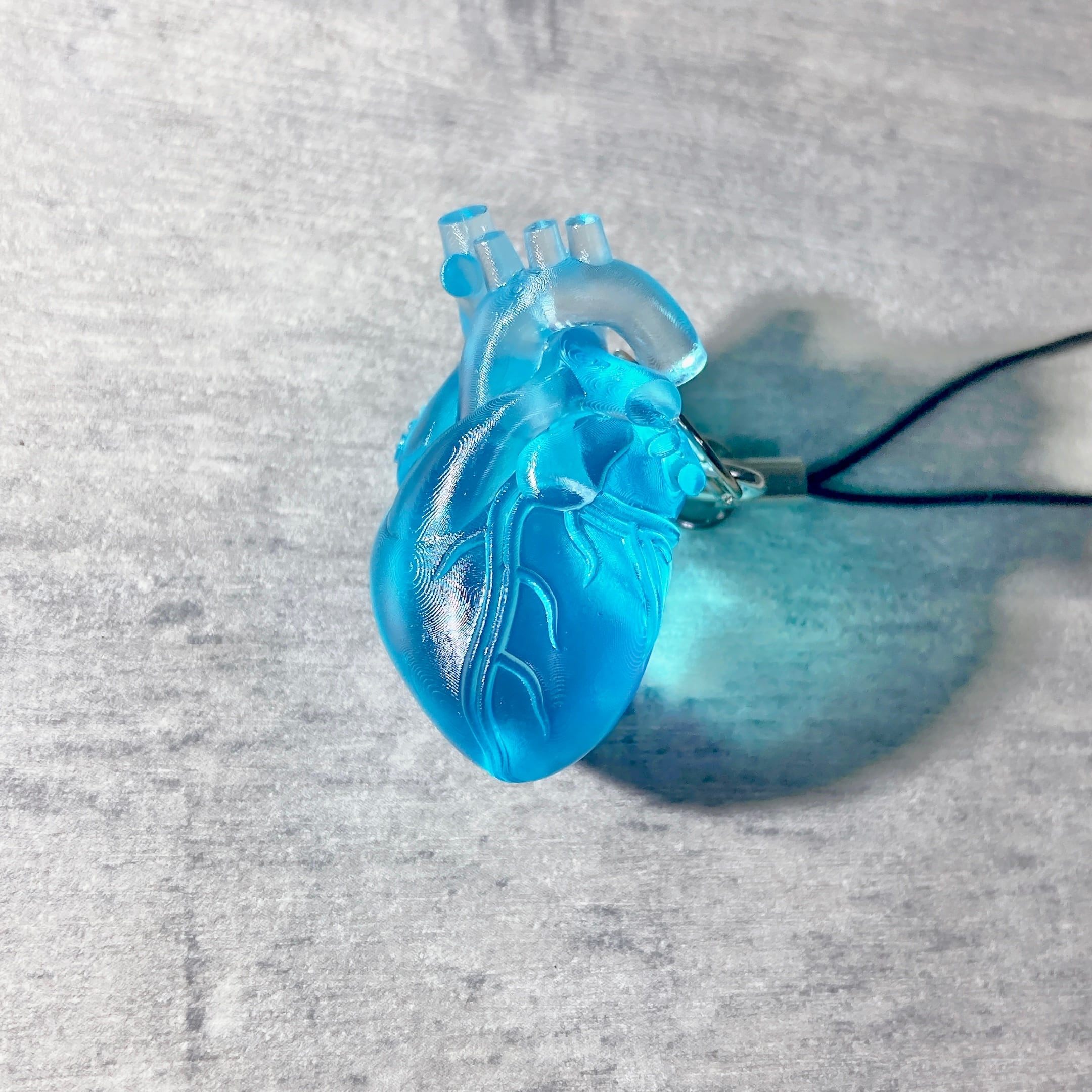 普段から循環器に関わる中で得た知識をフルに使い、また解剖の勉強もし直して、実際の心臓の構造に限りなく近いデザインにしました。各血管・チャンバー毎に別々のポリゴンを作成しそれぞれの位置関係をよく確認しながら組み合わせているので、超リアルな自信作です!心臓のデザインに余計なものを加えたくなかったので、ストラップを通す穴はあえて作らずに大動脈弓部を活用してストラップを通しました。