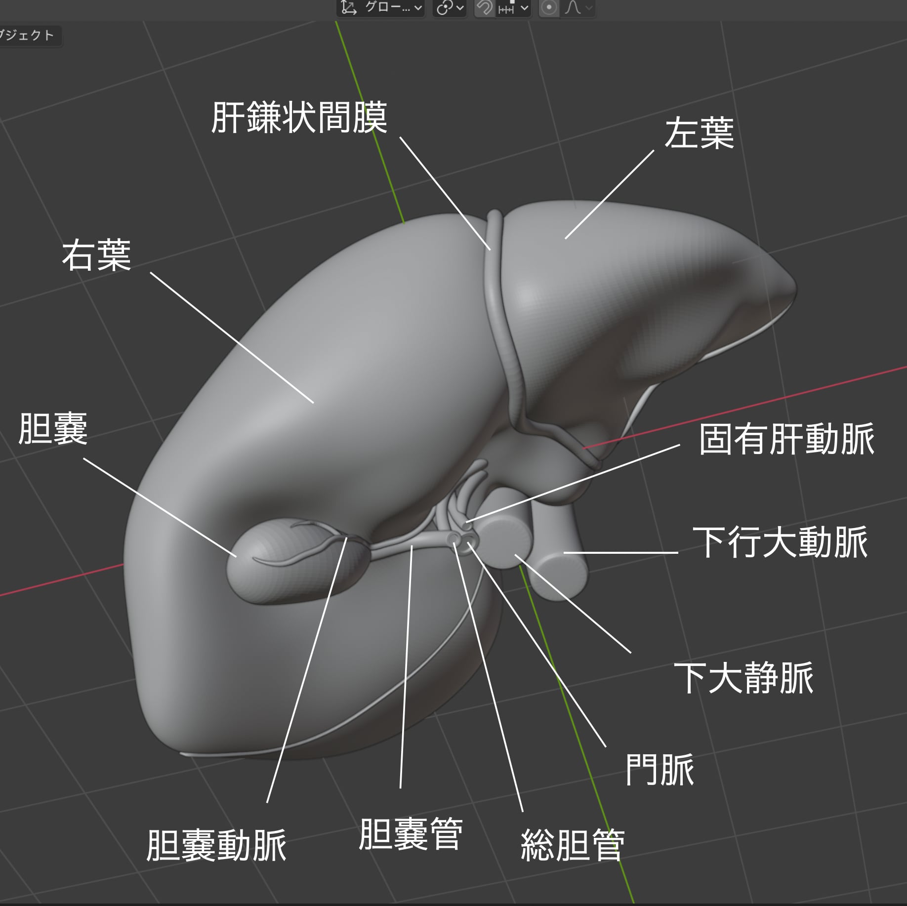 肝実質のなめらかなデザインにこだわりました。肝臓の表側の表面はつるんとなめらかな解剖をしています。それに対し内側の表面は、おおきなくぼみがたくさんある解剖をしています。このなめらかさこそ、臓器っぽい特徴であり美しさだと思っています。この解剖を表現する為にポリゴン数を超多数に増やしデザインしました。