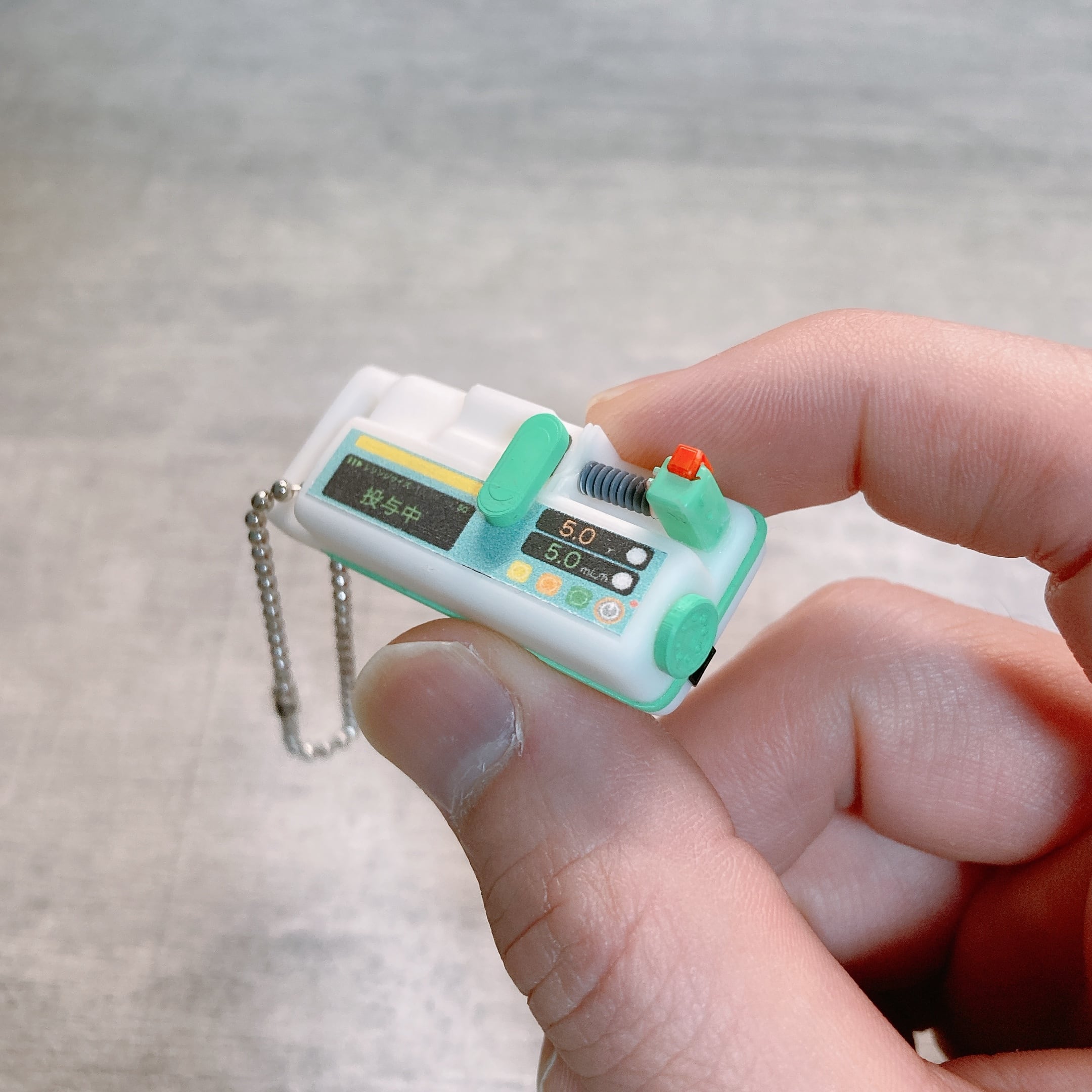 前作の輸液ポンプに引き続き、こちらも病棟やICUで働く方にとって馴染み深いシリンジポンプをミニチュアのキーホルダーにしました!シリンジポンプはシリンダーの蛇腹やダイアル部分など細かい部分が多くモデリングに苦労しましたが、その分より完成度の高いデザインに仕上がりました。いつも扱っているシリンジポンプがミニチュアのキーホルダーとして身につけられるって、我ながらなんだかワクワクします。(^^) シリンジポンプに愛着のある方、是非手に取って眺めてみてください