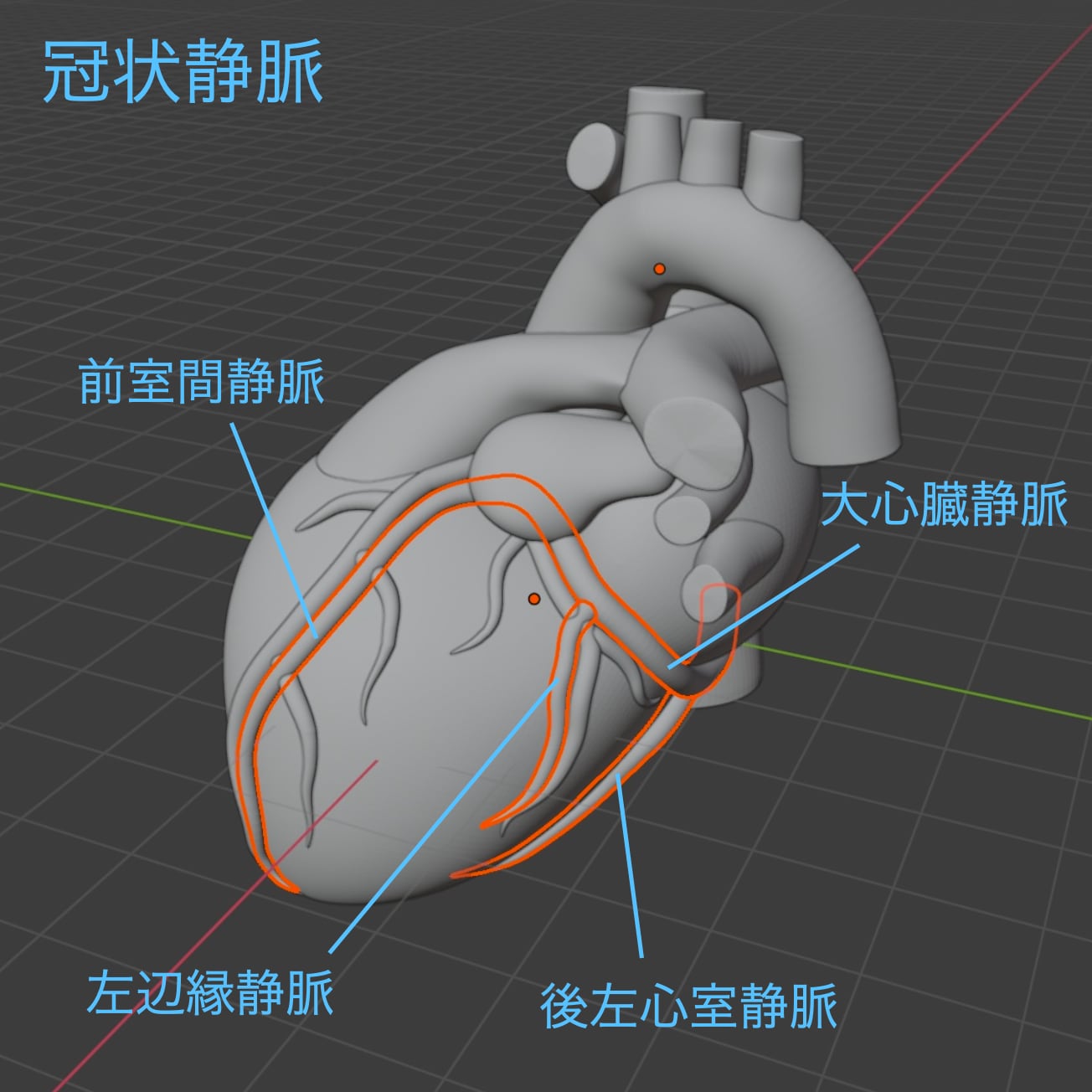 冠動脈に比べてあまり勉強する機会は少ないかもしれませんが、冠静脈の理解も同じくらい大切です。なので冠静脈の走行も正確にデザインしています。フィギュアが小さく、冠動脈・冠静脈の境界がわかりにくいですが、紹介の画像を見てイメージしてみて下さい。