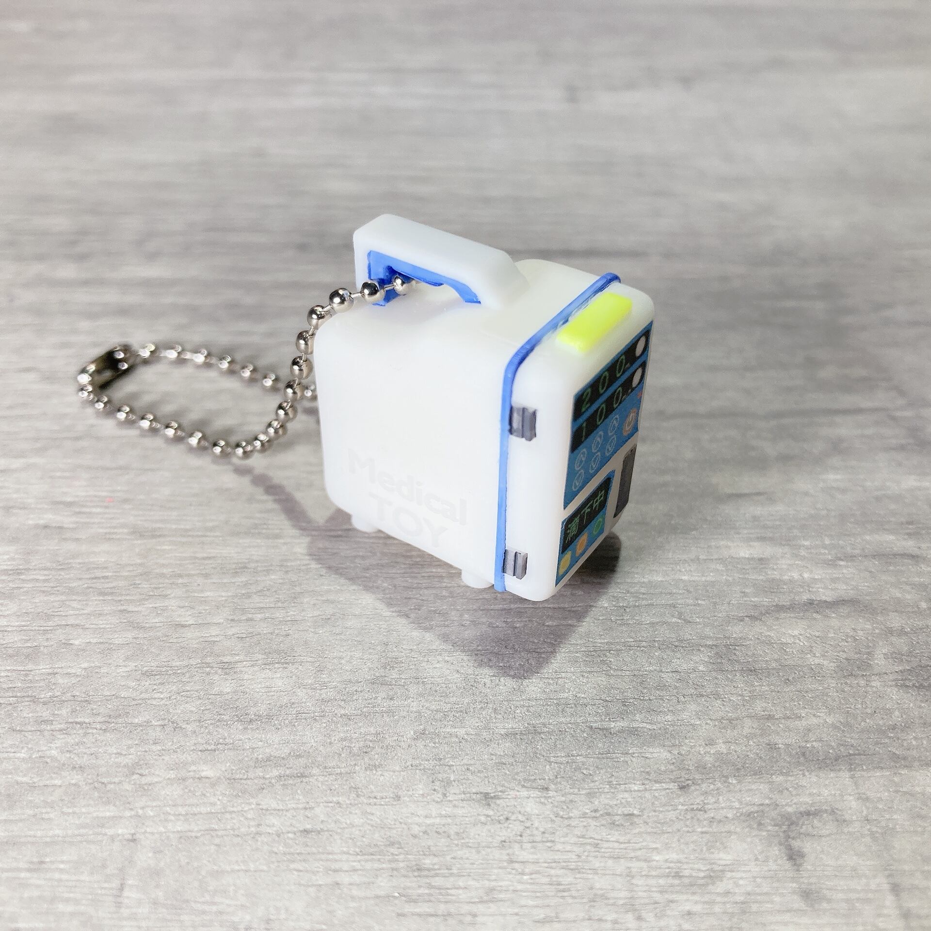 実際に臨床で使用される輸液ポンプは各メーカーから様々な機種が製造されています。今回の作品は、私が”あったらいいな”という機能を盛り込んで構想したオリジナルの輸液ポンプをキーホルダーとしたものです。代表的な機能に、