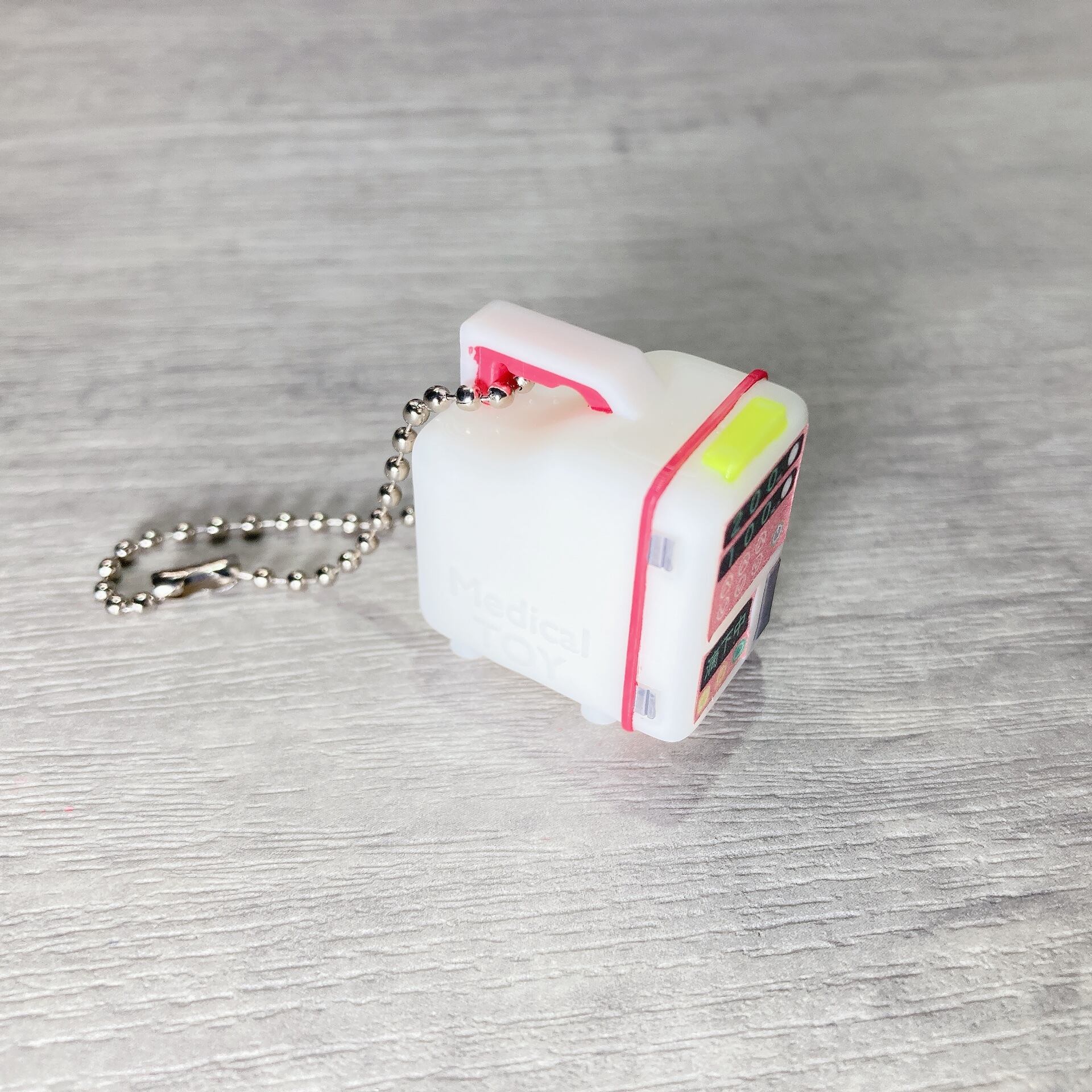 医療従事者として病院で働き始めると、おそらく1番初めに扱うME機器である輸液ポンプをミニチュアのキーホルダーにしてみました!特に一般病棟やICUで働く方にとって最も馴染み深い機器の一つではないでしょうか。こちらのキーホルダーは3Dプリンターで造形し、1つ1つ筆を使いせっせと塗装しました。正面の表示部・操作部などはデカールを自作し貼り付けることで輸液ポンプらしい見た目を整えています。輸液ポンプに愛着のある方、是非手に取って眺めて見て下さい♪